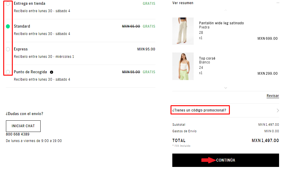 Después de seleccionar la forma de envío, en la parte derecha, podrás ver tus productos seleccionados y la cantidad total. Puedes añadir un código promocional, en la parte derecha, en caso de disponer de uno.