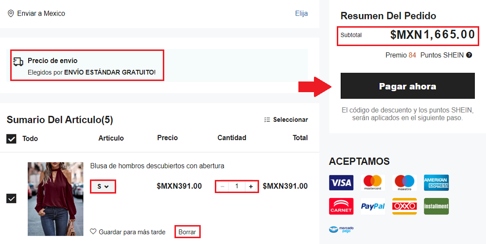 Visa, MasterCard, American Express, Carnet, Visa Electron, Maestro, PayPal, Oxxo, Puntos Shein obtenidos en otras compras.