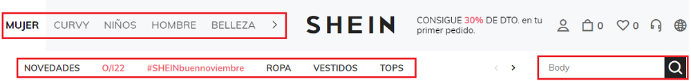 Por otro lado, la página te ofrece diferentes categorías, situadas en la parte superior central. En este caso, puedes buscar tus artículos en función del género, curvy, niños/as, belleza, novedades, etc. Si pasas por encima de cada categoría se desplegará un listado con muchas opciones (novedades, vuelta en stock, destacados…), y elige lo que buscas.