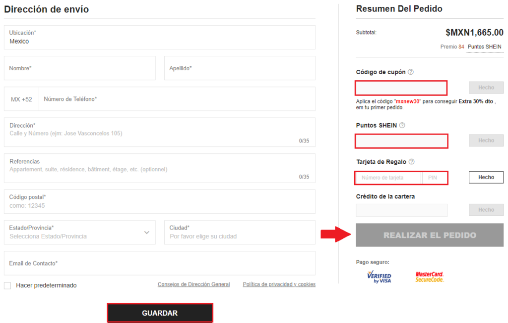 En este paso deberás indicar la dirección de entrega de tu pedido. Para ello rellena todos los campos relativos a la dirección. En el panel situado en el lado derecho podrás añadir cupones de descuento, puntos Shein que hayas ido acumulando, Número de Tarjeta de Regalo.