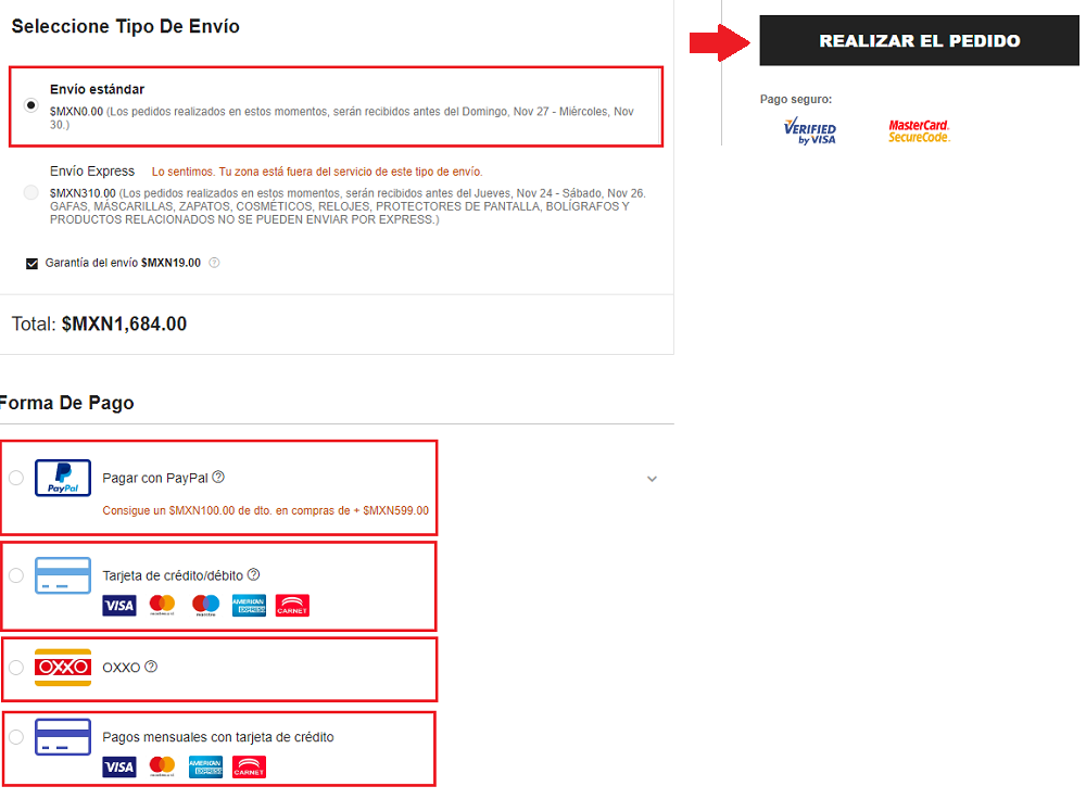 6. Selecciona el tipo de envío y clica en ‘Realizar el pedido’